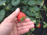 いちごは上の写真のように指の間に茎を挟みこみ、親指でくるっと返せば簡単に外れます。時々みかけるますが、いちごを力ずくで茎ごと引っ張ってしまうかたがいらっしゃいますが、いちごの苗は大変痛みやすくなっておりますので、苗に負担を掛けないようにそっといちごを摘み取って下さるようお願いしいたします。また、茎を指でつまんで、茎ごと摘み取ってもOKです。